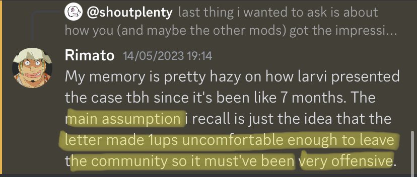 EDIT (2024/01): Rimato and another mod-at-the-time Dingle also said that if they had read the letter, they would’ve voted for a substantially shorter ban; see below.